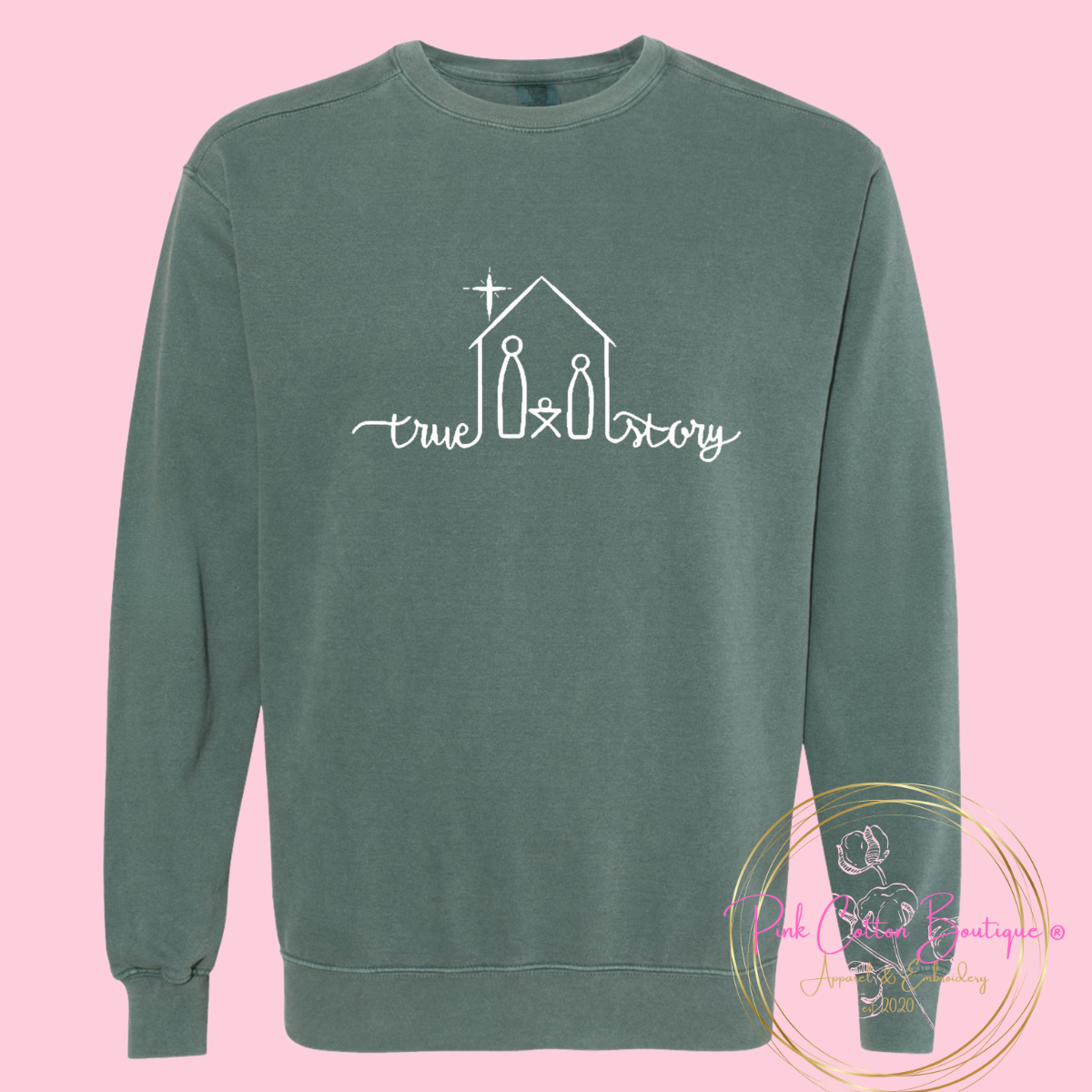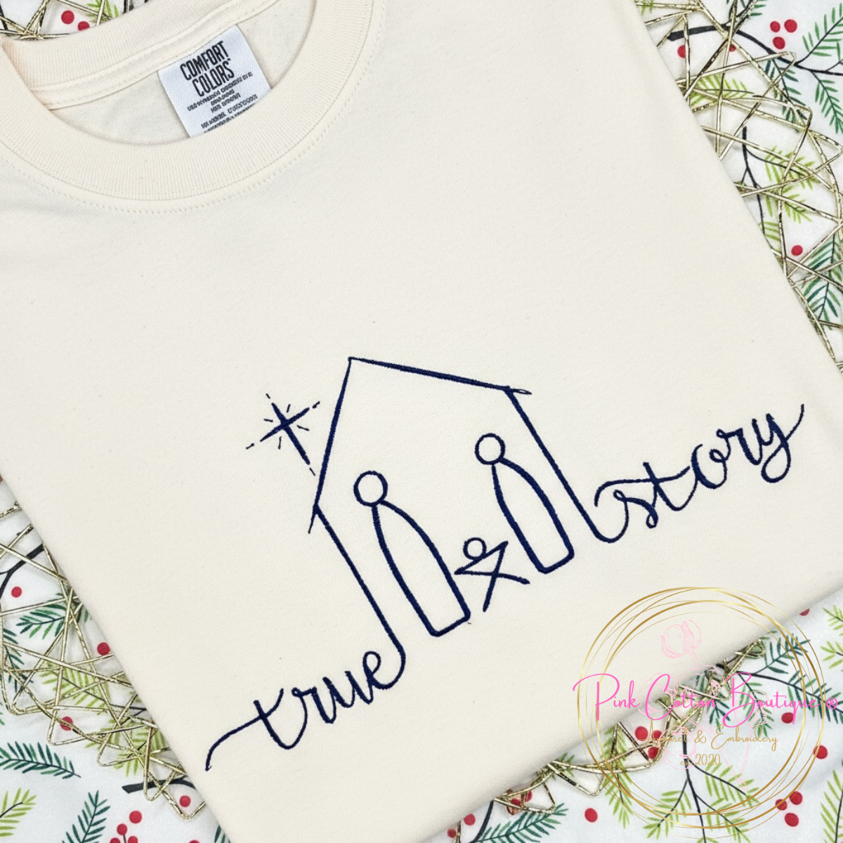 Celebrate the true meaning of Christmas with our beautifully simple “True Story” Nativity Tee. Embroidered minimalist line art design of the nativity scene — Mary, Joseph, and baby Jesus under the star — this shirt is a timeless reminder of the first Christmas.